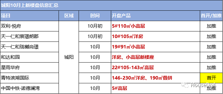 城阳十月份仅一个纯新盘入市,青特滨湖国际计划首开146-230㎡洋房、190㎡叠拼,具体信息还未释放。加推项目中,夏庄板块的双利·悦府和珑樾尚璟都将加推小高层,宸璟朗郡则入市小洋房产品;高新区邻青岛中学的刚需大盘星雨华府将推出一栋105-143㎡高层,上马板块的中铁诺德澜湾十月加推一栋88㎡高层,价格十分亲民;白云山板块的和达和园将继续加推洋房、小高层新楼座。