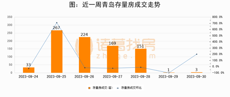 从存量房来看,2023年09月30日青岛存量房单日成交3套,比昨日增加2套,环比上涨200%。从近一周存量房成交来看,青岛存量房日均成交套数为121套,09月30日单日成交3套,低于近一周平均水平97.5%。