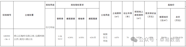 LS0301-36-1地块位于王家村梅岭东路以南、规划六路以东,占地面积6470㎡,容积率2.2,建面14234㎡,建筑密度30%,绿地率35%,建筑高度54米;起拍楼面地价22039元/㎡,起拍总价3.14亿元。