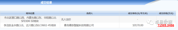 · 青岛青铁智能科技有限公司(青铁) 获得东李东大物流园7.04万㎡地块,楼板价10170元/㎡,总价7.16亿;