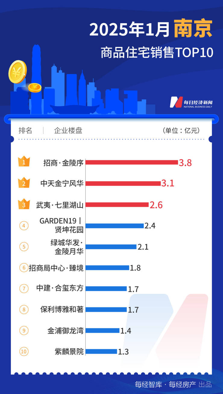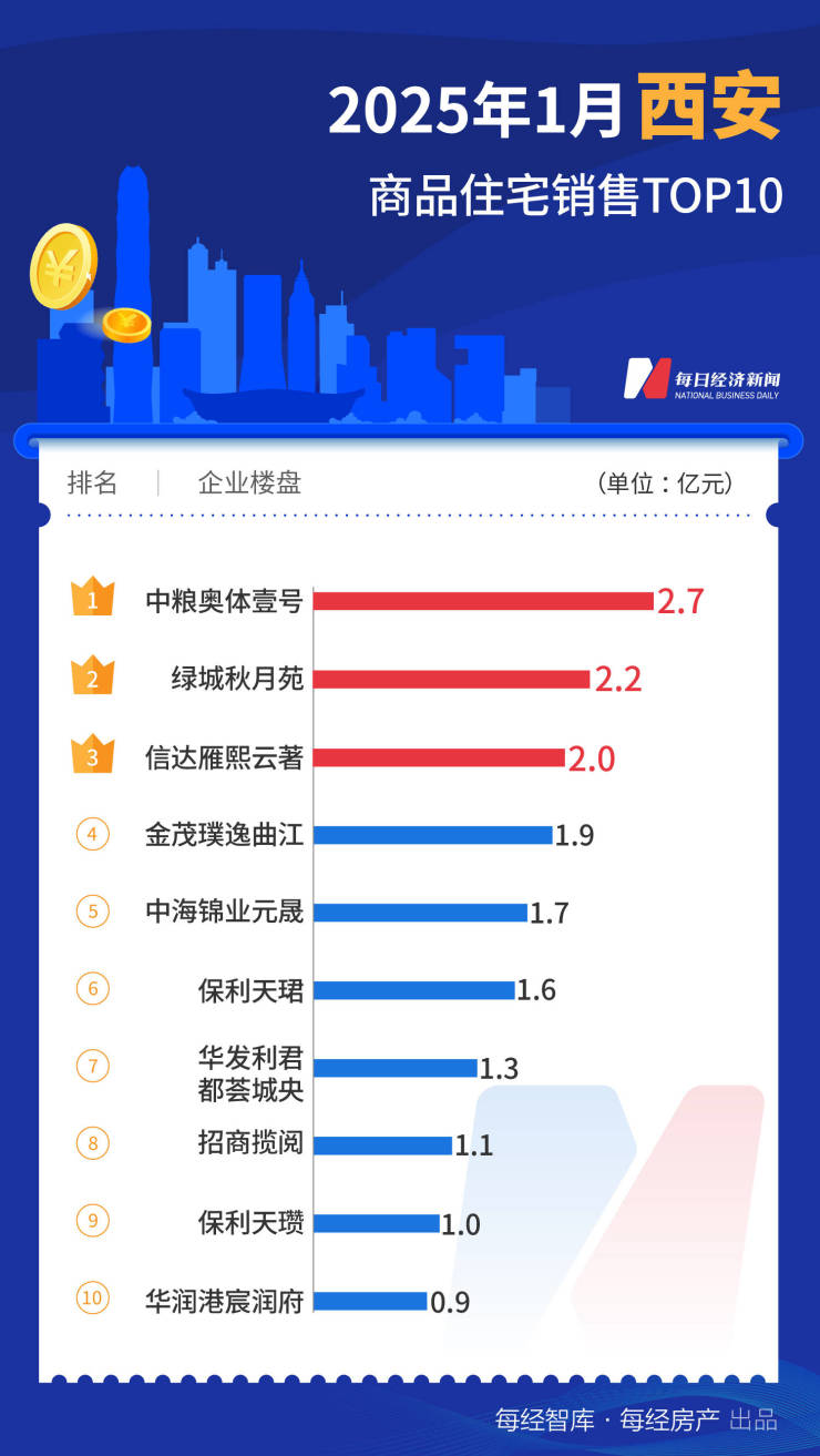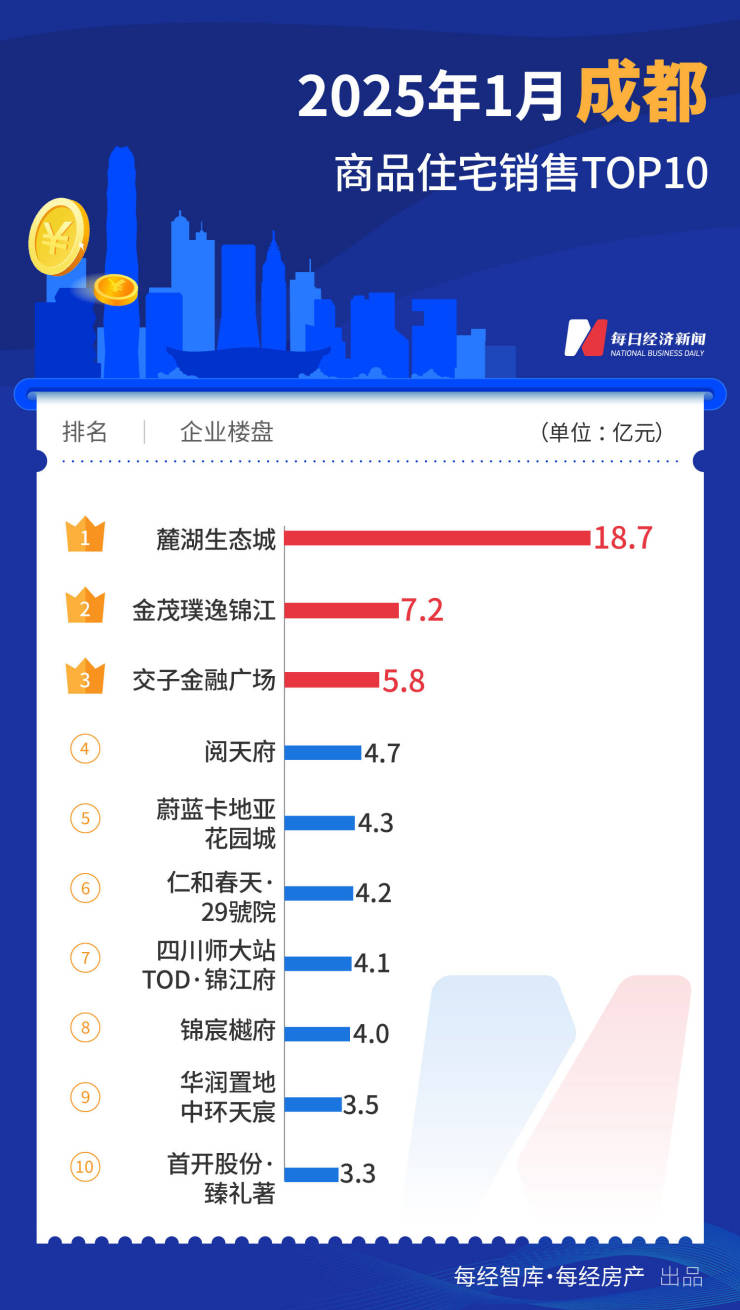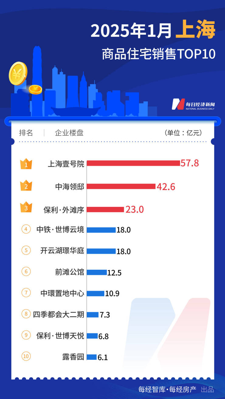 《每日经济新闻》记者结合中指研究院数据梳理发现,2025年楼市开局,上海仍然一骑绝尘,上海壹号院以57.8亿元销售额锁定全国销冠,第二名、第三名也诞生在上海,分别是中海领邸42.6亿元,保利·外滩序23亿元。