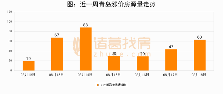 根据诸葛找房数据显示,青岛24小时涨价房源量为63套,较08月17日增加20套,环比上涨46.5%。与此同时,涨价房源占比小幅扩大,业主信心有所提升。