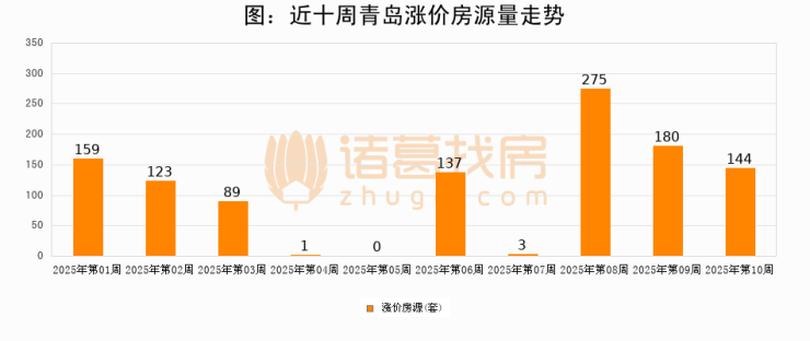 从调价房源来看,第10周青岛涨价房源144套,较上周下降20%。与此同时,10周涨价房源占比回落0.19个百分点,业主信心小幅波动,购房者可则需入市。
