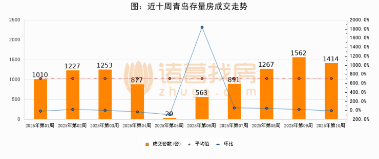 存量房方面,第10周青岛存量房成交1414套,较上周减少148套,环比下降9.5%。从近十周成交走势来看,周均成交套数为1009套,本周高于平均水平40.1%。