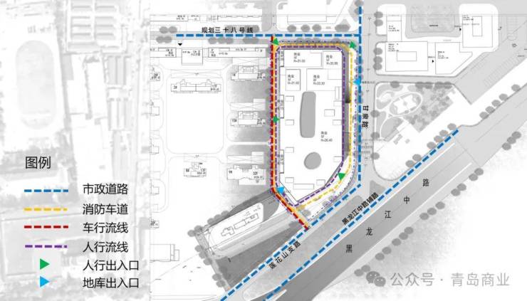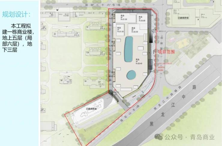 根据规划显示,项目西侧为在建住宅小区——云谷金茂府,北侧为在建商务办公用地,东侧为地铁三号线海尔路站。总用地面积约2.88公顷,其中含已建商务楼(总建筑面积29652.87平方米)和一栋拟建商业建筑。