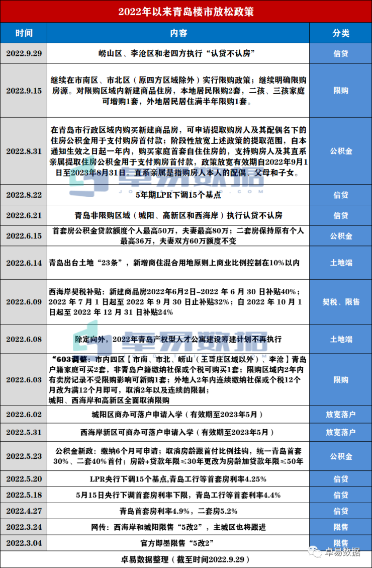 9月15日,青岛放松限购,市内四区的崂山、李沧和老四方取消限购,而限购松绑作用的一大要素信贷也出现松绑!