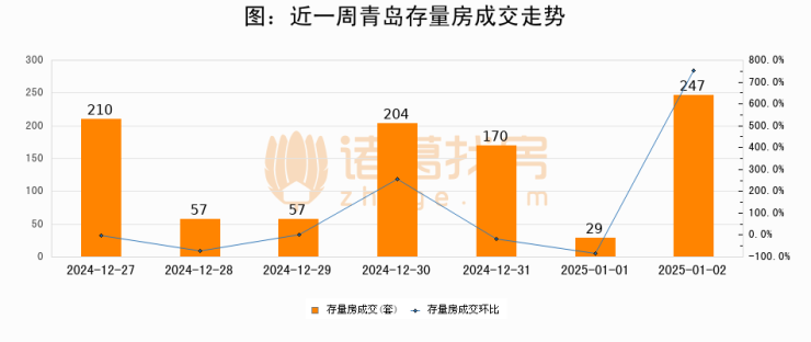 从存量房来看,2025年01月02日青岛存量房单日成交247套,比昨日增加218套,环比上涨751.7%。从近一周存量房成交来看,青岛存量房日均成交套数为139套,01月02日单日成交247套,高于近一周平均水平77.7%。