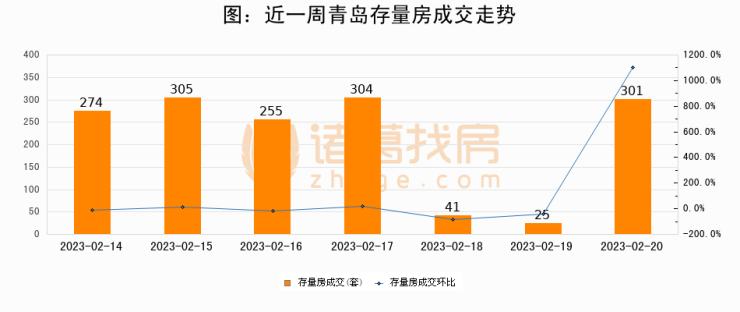 从存量房来看,2023年02月20日青岛存量房单日成交301套,比昨日增加276套,环比上涨1104%。从近一周存量房成交来看,青岛存量房日均成交套数为215套,其中02月15日成交量最高为305套,02月20日单日成交301套,高于近一周平均水平40%。