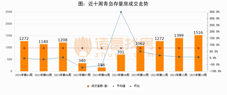 存量房方面,第12周青岛存量房成交1516套,较上周增加117套,环比上涨8.4%。从近十周成交走势来看,周均成交套数为1006套,本周高于平均水平50.7%。