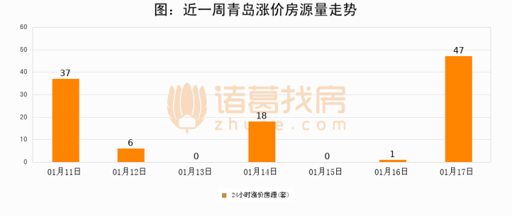 根据诸葛找房数据显示,青岛24小时涨价房源量为47套,较01月16日增加46套,环比上涨4600%。与此同时,涨价房源占比小幅扩大,业主信心有所提升。