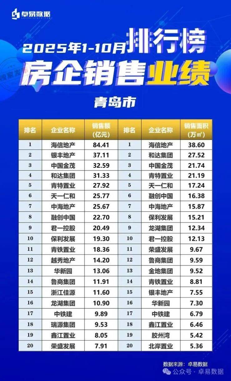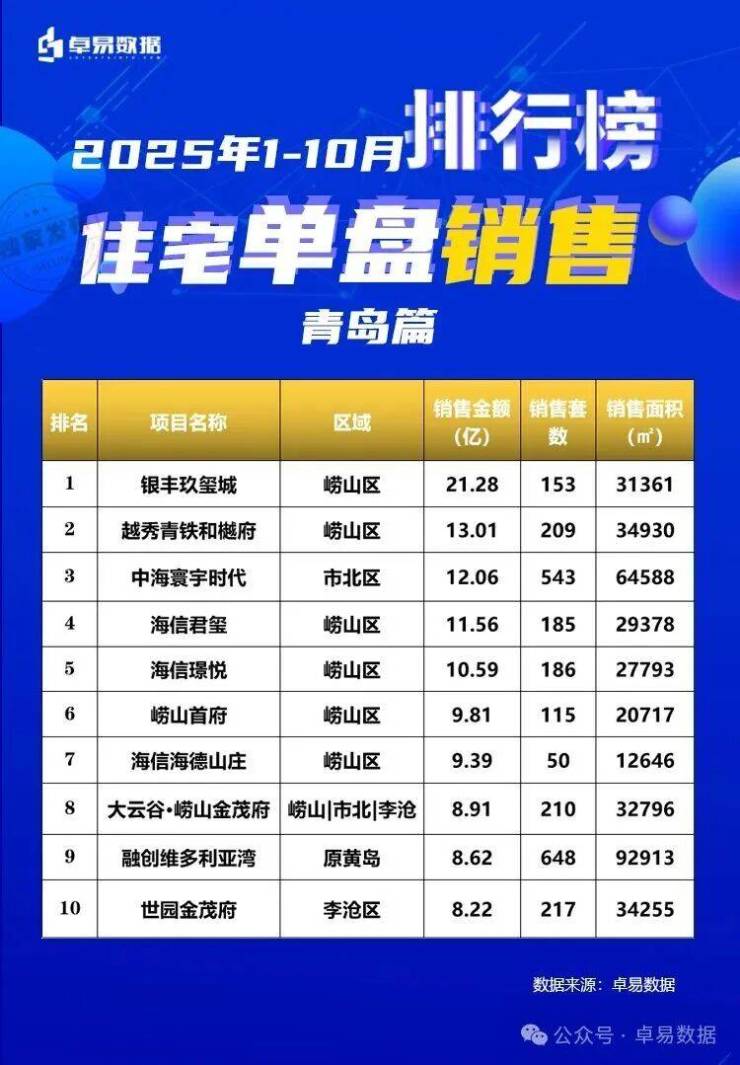 本榜单是根据卓易数据的独立研究,将青岛所有可售项目按照工商注册股权逐一进行权益拆分,剔除重复并表、重复计算的统计方法,展现一个客观的房企商品房销售权益“战绩”,更能清楚一家房企的实际业绩,更好的用于课题研究和监测。