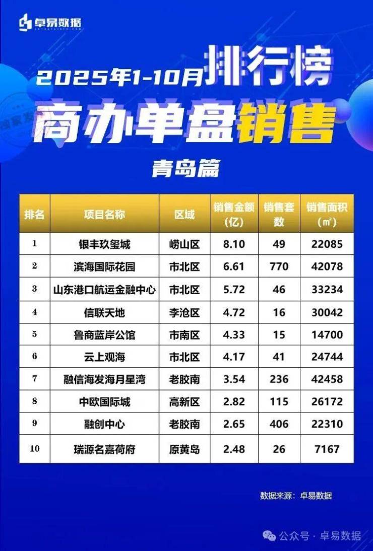 商办市场中,第一的银丰玖玺城8.10亿、滨海国际花园6.61亿、山东港口航运金融中心5.72亿。