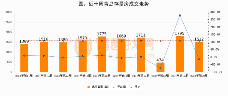 存量房方面,第20周青岛存量房成交1512套,较上周减少283套,环比下降15.8%。从近十周成交走势来看,周均成交套数为1491套,本周高于平均水平1.4%。