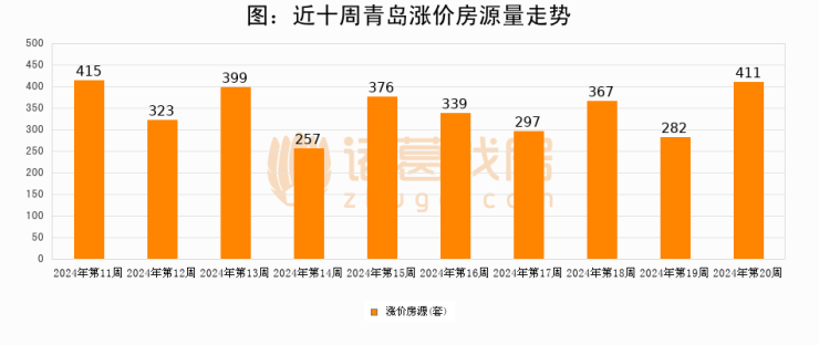 从调价房源来看,第20周青岛涨价房源411套,较上周上涨45.7%。与此同时,20周涨价房源占比提升0.56个百分点,业主信心持续恢复。