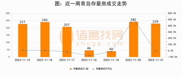 从存量房来看,2023年11月21日青岛存量房单日成交229套,比昨日减少13套,环比下降5.4%。从近一周存量房成交来看,青岛存量房日均成交套数为175套,11月21日单日成交229套,高于近一周平均水平30.9%。