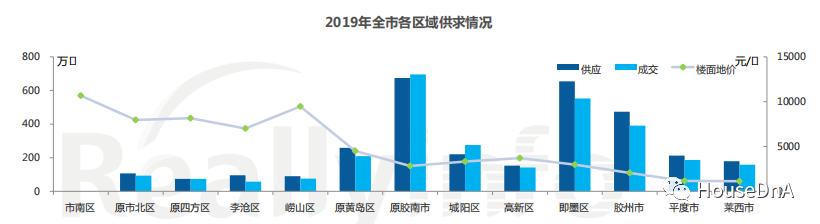 再来看全年成交情况,2019年商品房均价较为平稳,二三季度供销波动上升,四季度销量达到全年先进。土地大量出让,直接影响商品房库存量情况,截止到去年末商品房库存2889万㎡ 同比上升了26%,去化周期高达21个月,去化压力巨大。去年原胶南市位居区域成交首位,其次为胶州市、即墨区,市场存量则主要集中在西城区和近郊区,去化压力较大。