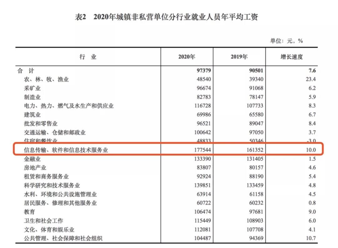 城镇非私营单位中,年平均工资较高的3个行业分别是信息传输、软件和信息技术服务业177544元,科学研究和技术服务业139851元,金融业133390元,分别为全国平均水平的1.82倍、1.44倍和1.37倍。