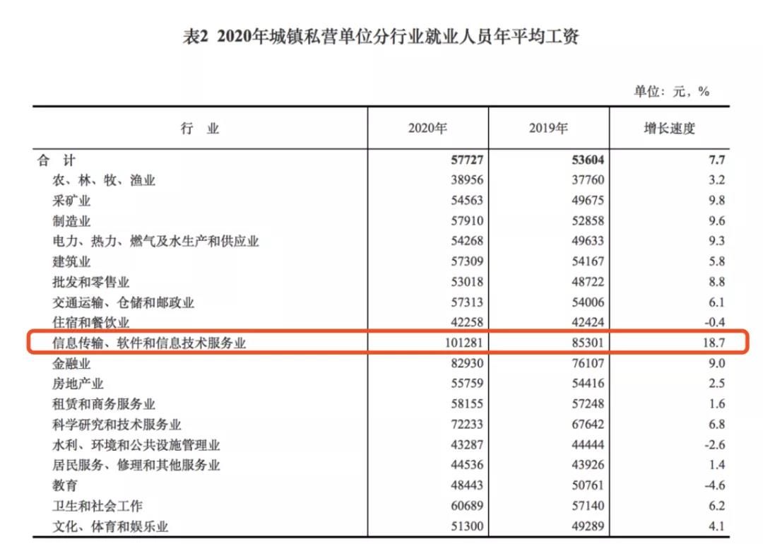 城镇私营单位中,年平均工资较高的3个行业分别为信息传输、软件和信息技术服务业101281元,金融业82930元,科学研究和技术服务业72233元,分别为全国平均水平的1.75倍、1.44倍和1.25倍。