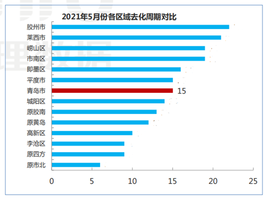 根据锐理数据显示,截止到五月末,青岛全市平均的去化周期维持在15个月左右,主城区除了市南崂山部分豪宅不愁卖导致去化周期相对较长,市北李沧的去化周期均在9个月以内。
