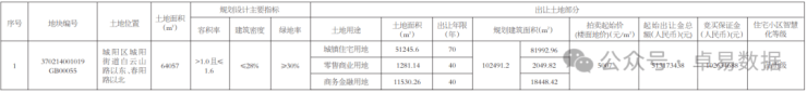 地块位于城阳区城阳街道白云山路以东、春阳路以北,占地面积64057㎡,容积率1.6,建面积102491.2㎡(住宅81992.96㎡、零售商业2049.82㎡、商务金融18448.42㎡),起始楼面地价5007元/㎡,起拍总价5.13亿元,竞买保证金1.03亿元。