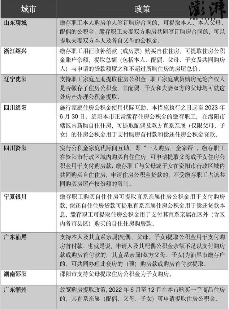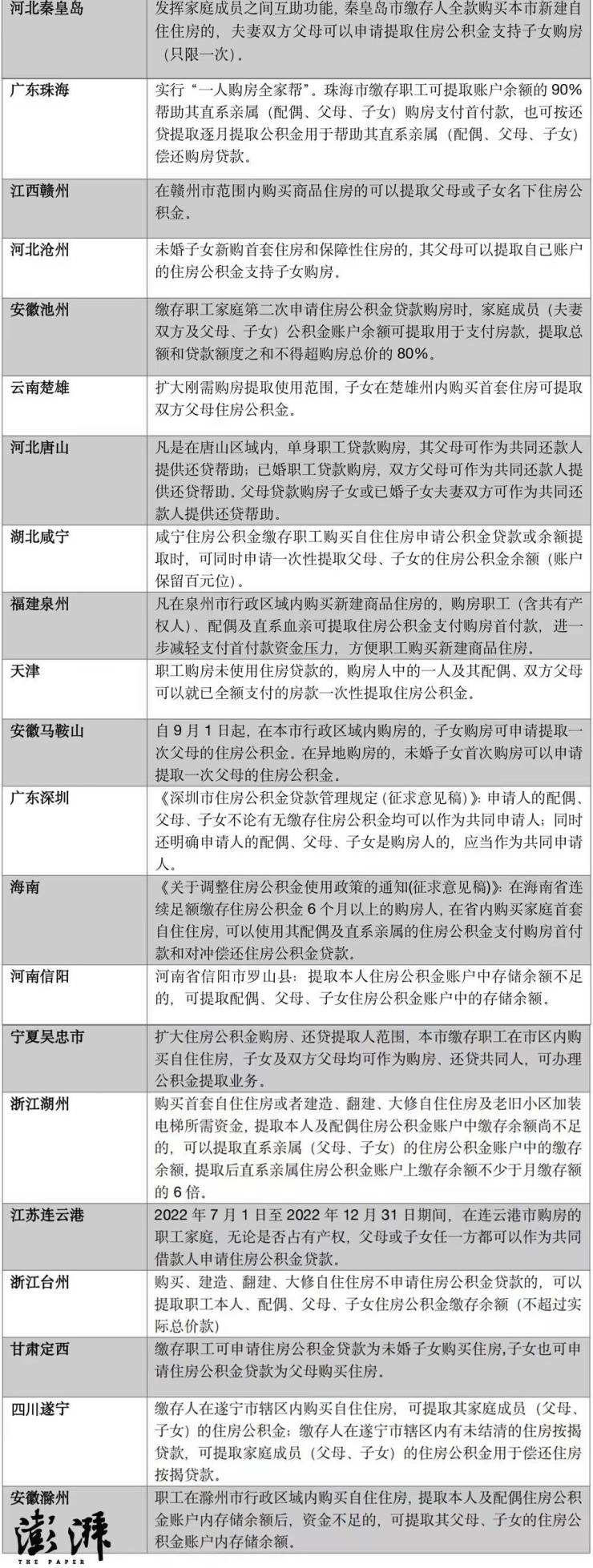 据澎湃新闻不完全统计,今年以来,至少包括湖南邵阳、广东潮州、河北秦皇岛、广东珠海、江西赣州、河北沧州、安徽池州、云南楚雄、河北唐山、湖北咸宁、福建泉州、天津、安徽马鞍山、广东深圳、海南、河南信阳、宁夏吴忠市、浙江湖州、江苏连云港、浙江台州、甘肃定西、四川遂宁、安徽滁州、广东汕尾、宁夏银川、四川资阳、四川绵阳、辽宁沈阳、浙江绍兴、山东聊城等超30个城市发布公积金贷款新政,多地在政策中提到,子女购房可提取父母公积金,实行“一人购房全家帮”。