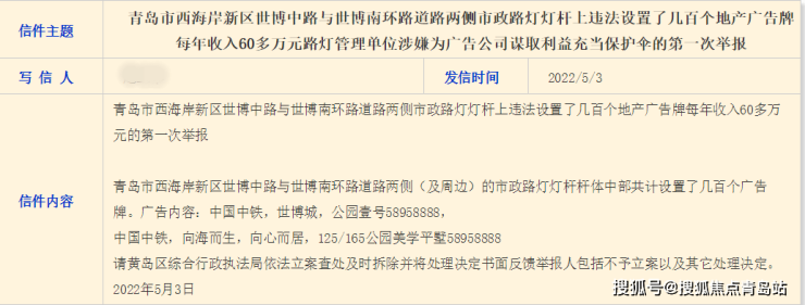 5月3日,有市民在政务网举报,西海岸新区世博中路与世博南环路道路两侧市政路灯灯杆上有几百个地产广告牌,内容包括中国中铁、世博城、公园壹号以及电话号码等字样。