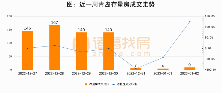 从存量房来看,2023年01月02日青岛存量房单日成交9套,比昨日增加5套,环比上涨125%。从近一周存量房成交来看,青岛存量房日均成交套数为87套,其中12月28日成交量最高为167套,01月02日单日成交9套,低于近一周平均水平89.7%。