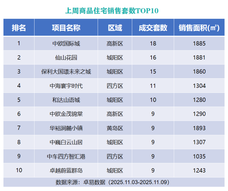 从各项目成交套数来看,位于高新区的中欧国际城以成交18套成绩居排行榜首位;位于城阳区的仙山花园以成交16套成绩上榜第二位;位于城阳区的保利大国璟未来之城以成交15套的成绩列榜单第三位。