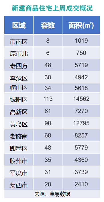 从各区成交情况来看,上周城阳区新建商品住宅以成交面积14562㎡的成绩,位列上周各片区新建商品住宅成交面积榜首位;原黄岛区以成交面积12795㎡的成绩,位列成交面积榜第二位;原胶南市以成交面积8257㎡的成绩,位列成交面积榜第三位。