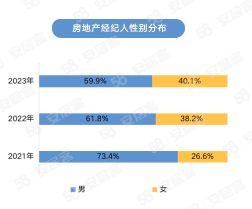 从历年数据可以看出,房地产经纪人中的女性占比逐年提升。报告显示,房地产经纪人中的女性占比从2021年的26.6%上升到2023年的40.1%,房地产经纪行业对女性从业者的认可度逐步提高。部分房地产经纪公司还面向“宝妈”等女性群体提供灵活的就业岗位,以及体系化的职业培训支持。