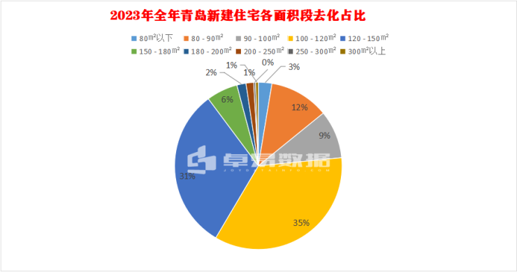2023年1-12月在全市的商品住宅去化中,从需求结构来看,100㎡以下的占比25.4%相比前半程拉升,100-120㎡面积段成交最多占比37.95%,与120-150㎡两个面积段加起来合计约72%。