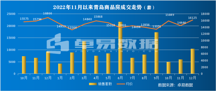 12月青岛新建商品房成交10482套,成交128.89万㎡,成交总价207.84亿;环比11月分别上涨75%、75%和96%;同比去年分别上涨26%,25%、20%。其中12月新建住宅成交6977套,均价14441元/㎡。