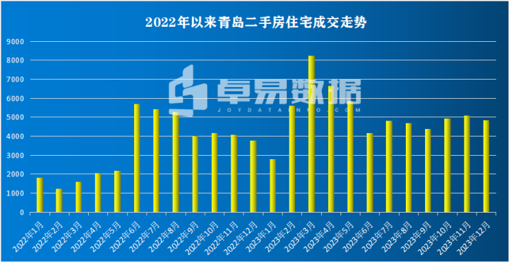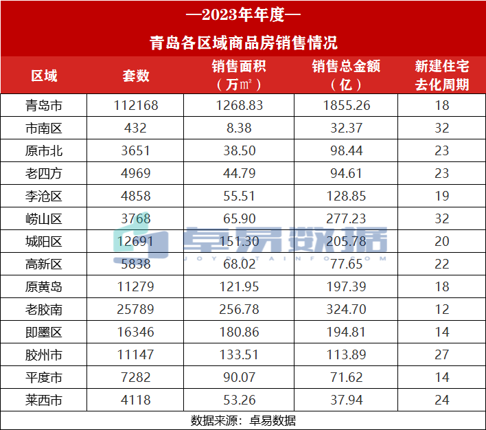据卓易数据统计:截止到12月30日,2023年全年青岛新建商品房网签成交112168套(不含退房),成交面积1268.83万㎡,成交总金额1855.26亿,成交套数相比去年上涨1.8%,成交面积、总金额分别下降2.6%、8.8%。