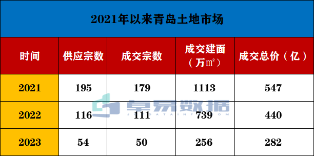 土地层面:2023年土地供应政策调整,建立出让清单并提前3个月发布,且取消最高限价。2023年青岛辖区内住宅类土地供应54宗,成交50宗(流拍3宗,中止1宗),成交总建面255.52万㎡,成交总价281.85亿。全国性TOP级房企有保利、金茂、中海、金地和越秀拿地,本土海信和鑫江均拿下4宗地,其余多为青岛地方平台及省内其他企业。