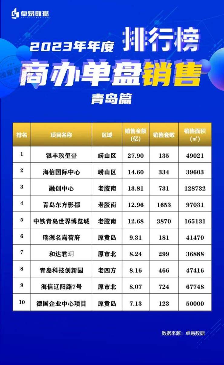 商办市场中,TOP10网签123亿,其中银丰玖玺臺签约27.9亿办公、海信国际中心14.6亿、融创中心13.81亿、东方影都集中签约12.96亿,中铁青岛世界博览城12.68亿。
