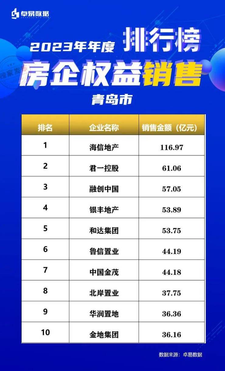本榜单是根据卓易数据的独立研究,将青岛所有可售项目按照工商注册股权逐一进行权益拆分,剔除重复并表、重复计算的统计方法,展现一个客观的房企商品房销售权益“战绩”,更能清楚一家房企的实际业绩,更好的用于课题研究和监测。