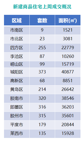 从各区成交情况来看,上周城阳区新建商品住宅成交373套,成交面积为40877㎡,位列上周各片区新建商品住宅成交面积和成交套数首位;原胶南市以成交320套,成交面积38546㎡的成绩名列第二;即墨区以单周成交316套,成交面积36203㎡列第三位。