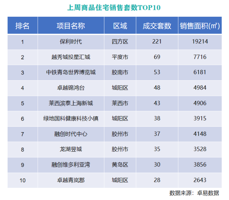 排在第四到第十位的分别是先进锦鸿台、莱西滨泰上海新城、绿地国科健康科技小镇、融创时代中心、龙湖昱城、融创维多利亚湾和先进青岚郡。从各区及各项目的成交情况来看,上周新建商品住宅成交以近郊各区项目为主,主城区仅有原四方区有一个项目上榜。