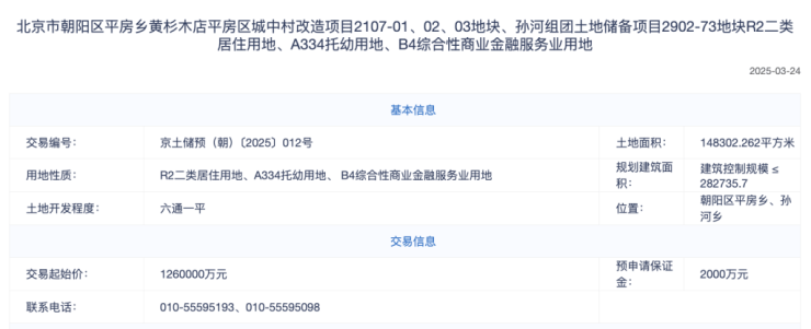 3月24日,据北京市规划和自然资源委员会官网,北京挂牌朝阳区组团用地预申请,起始价为126亿元。