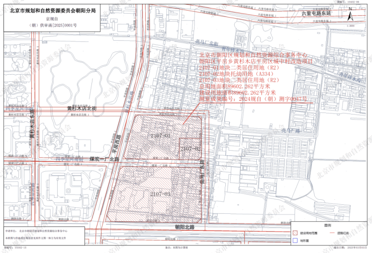 地块出让信息显示,此次组团地块位于北京市朝阳区平房乡、孙河乡。地块交易编号京土储预(朝)〔2025〕012号,即北京市朝阳区平房乡黄杉木店平房区城中村改造项目2107-01、02、03地块及孙河组团土地储备项目2902-73地块,土地面积为148302.262平方米,规划建筑面积282735.7平方米,用地性质为R2二类居住用地、A334托幼用地、 B4综合性商业金融服务业用地。