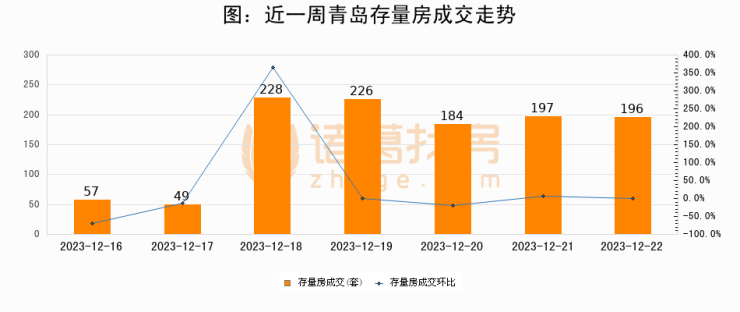 从存量房来看,2023年12月22日青岛存量房单日成交196套,比昨日减少1套,环比下降0.5%。从近一周存量房成交来看,青岛存量房日均成交套数为162套,12月22日单日成交196套,高于近一周平均水平21%。