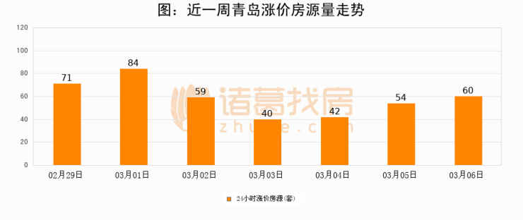 根据诸葛找房数据显示,青岛24小时涨价房源量为60套,较03月05日增加6套,环比上涨11.1%。与此同时,涨价房源占比小幅扩大,业主信心有所提升。