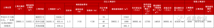 地块位于李沧区合川路以东、广水路以南,占地面积28693.5㎡,建面31832.2㎡(住宅28032.2㎡,商服1000㎡,幼儿园2800㎡),容积率1.2(不含幼儿园),楼面价12705元/㎡,总价3.69亿,最高限价14610元/㎡,最高限价4.24亿,竞买保证金3.69亿。
