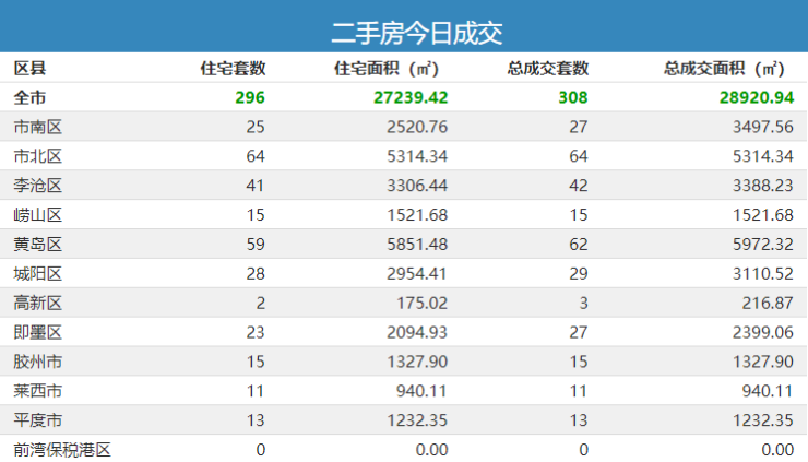 根据青岛网上房地产交易数据显示,17日,岛城一手房、二手房市场各物业类型共成交877套,其中一手房成交569套,总成交面积65401.76㎡。其中住宅成交了490套,总成交面59653.66㎡。17日岛城各区市中,黄岛区住宅成交148套,列销售榜排名前列位;即墨区住宅成交101套,列销售榜第二位;城阳市住宅成交62套,列销售榜第三位。