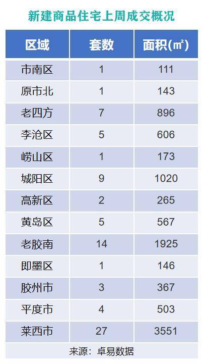 从各区成交情况来看,上周原胶南市新建商品住宅以成交68套,成交面积8268㎡的成绩,位列上周各片区新建商品住宅成交面积和成交套数榜首位;城阳区以成交56套,成交面积6826㎡的成绩,位列成交面积榜第二位;平度市以成交57套,成交面积5836㎡的成绩,位列成交面积榜第三位。