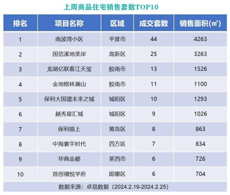 从各项目成交套数来看,位于平度市的南波湾小区以成交44套的成绩列榜单首位;位于高新区的国信溪地美岸以成交25套成绩上榜第二位;位于西海岸的龙湖亿联春江天玺以成交13套的成绩列榜单第三位。