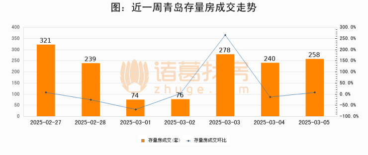 从存量房来看,2025年03月05日青岛存量房单日成交258套,比昨日增加18套,环比上涨7.5%。从近一周存量房成交来看,青岛存量房日均成交套数为212套,03月05日单日成交258套,高于近一周平均水平21.7%。