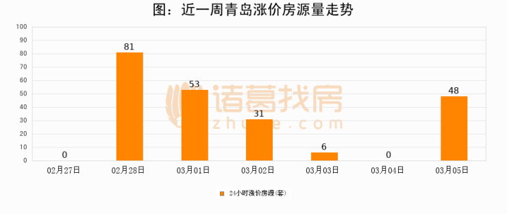 根据诸葛找房数据显示,青岛24小时涨价房源量为48套,较03月04日增加48套,环比上涨0%。与此同时,涨价房源占比小幅扩大,业主信心有所提升。