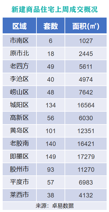 从各区成交情况来看,上周即墨区新建商品住宅以成交面积17279㎡的成绩,位列上周各片区新建商品住宅成交面积榜首位;城阳区以成交面积16564㎡的成绩,位列成交面积榜第二位;原胶南市以成交面积16421㎡的成绩,位列成交面积榜第三位。