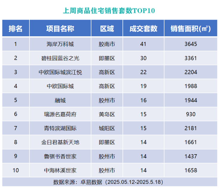 从各项目成交套数来看,位于西海岸新区的海岸万科城以成交41套的成绩列榜单首位;位于即墨区的碧桂园蓝谷之光以成交30成绩上榜第二位;位于高新区的中欧国际城滨江悦以成交22套的成绩列榜单第三位。